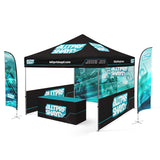 Combo #2 is our standard aluminum frame 10'x10' which is ideal for majority of events. In this combo we add the the half walls on each side and a full backwall. We also added the feather flags and a 6ft table cover.